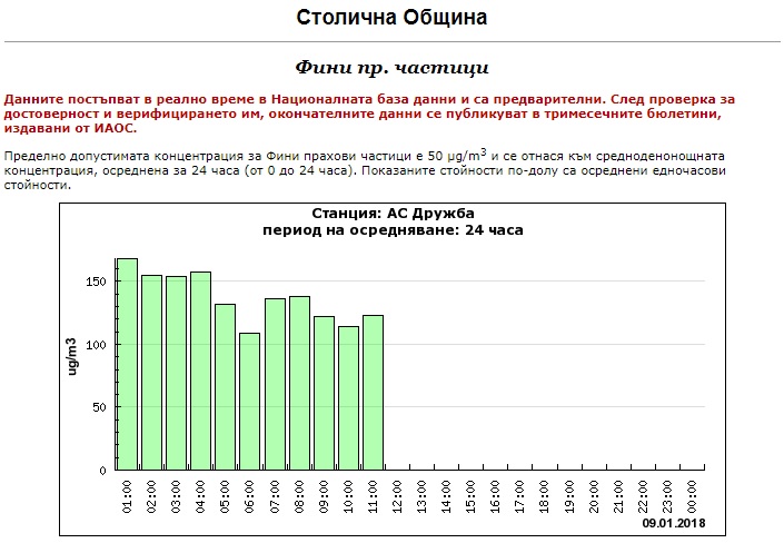 В подкрепа на твърдението на Фандъкова е и почасовият мониторинг, публикуван пак на сайта на СО, като данните са на Изпълнителната агенция по околната среда (ИАОС). Според него станциите, разположени в различни части на София, измерват превишаване на нивата. За меродавни се приемат осреднените данни за изминалите 24 часа, но и те показват превишаване. Превишаване в пъти показват и двете граждански системи за мониторинг - airtube.info и airbg.info.