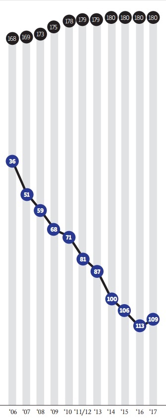 За сравнение - през 2006 г. медийната среда нарежда България на 36-о място от общо 168 държави. Това болезнено губене на позиции в рамките на десетина години показва срив в доверието в медийния продукт (виж графиката).