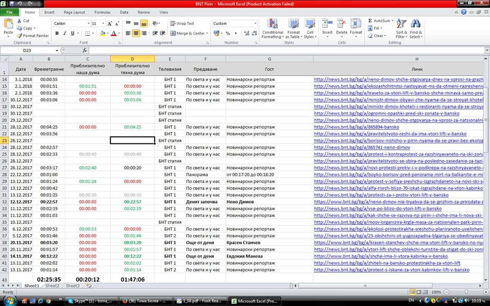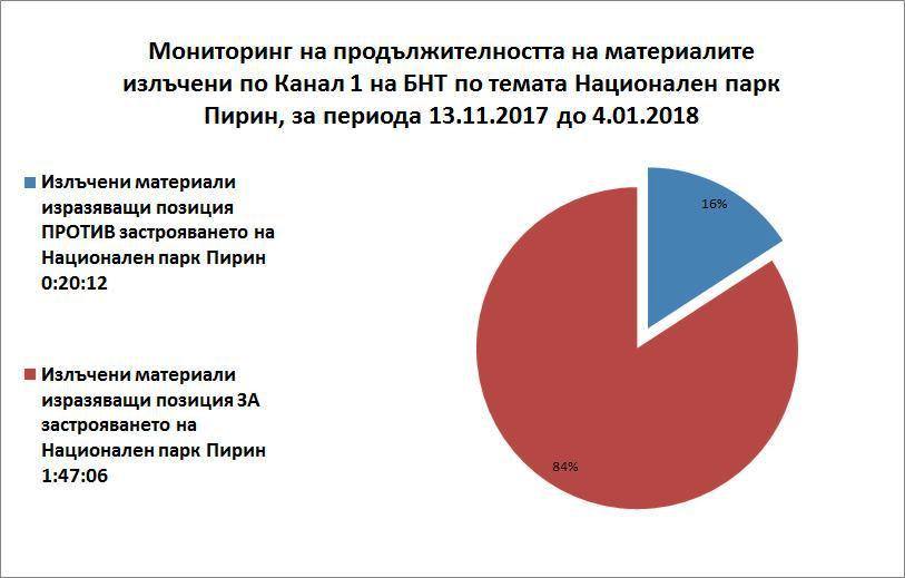 От справката става ясно, че за този интервал на темата Пирин и ски зоната в Банско са посветени общо 2 часа и 25 минути. От тях думата на зелените организации и активисти е дадена за 20 минути, а на защитниците на строителсвото на писти и съоръжения в парка - 1 час и 47 минути. Оставащите минути разлика са кадри без коментар и чисто информативни материали, без оценъчен елемент. Всеки материал по темата е приложен със съответния линк.