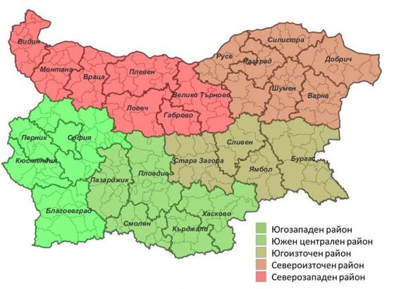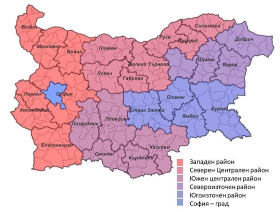 Първи вариант с пет района: Югозападен, включващ областите София-град, Софийска, Благоевград, Кюстендил и Перник; Южен централен, включващ областите Пазарджик, Пловдив, Хасково, Кърджали и Смолян; Югоизточен, включващ областите Стара Загора, Сливен, Бургас и Ямбол; Североизточен, включващ областите Търговище, Русе, Разград, Силистра, Добрич, Варна и Шумен; Северозападен, включващ областите Видин, Монтана, Враца, Плевен, Ловеч, Габрово и Велико Търново.