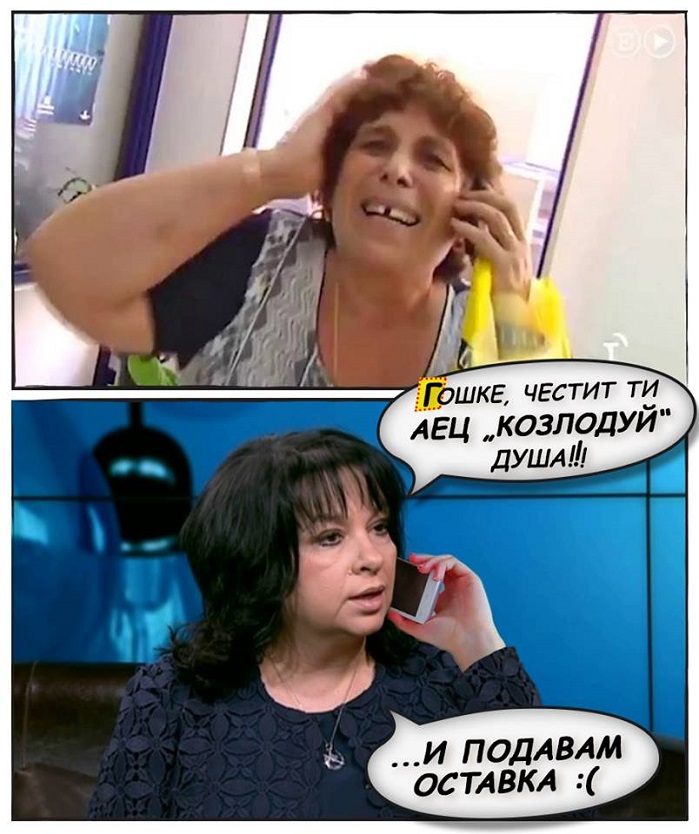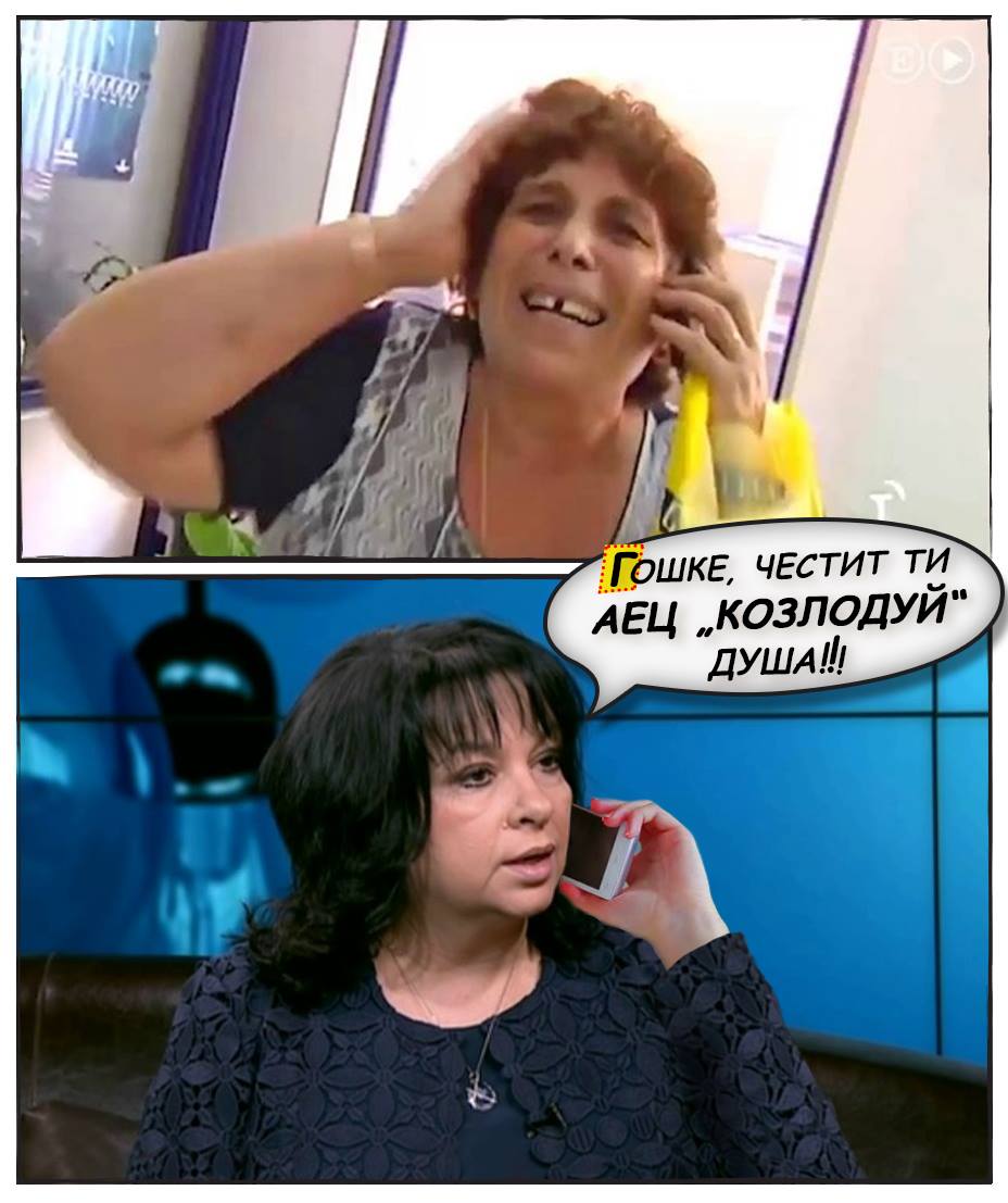 Иван Червенков е изобразил прочутата Гошка, която спечели над 60 млн. евро от лотарията в Испания. Министърката на енергетиката (вече в оставка) Теменужка Петкова ѝ казва: