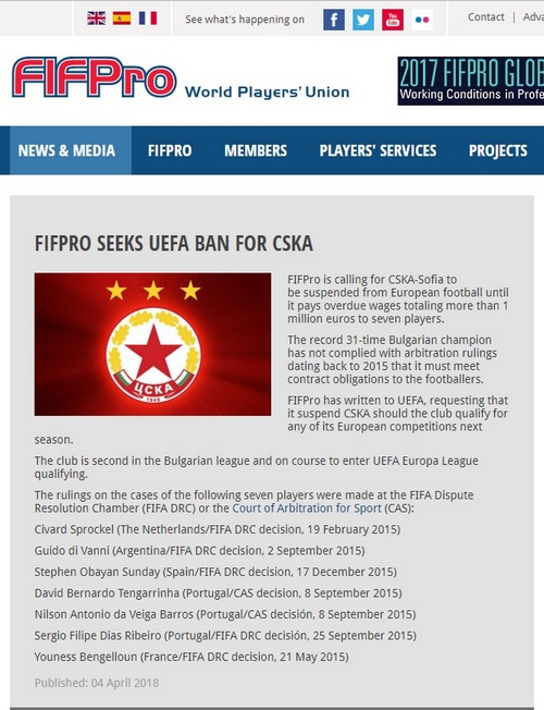 Както се вижда в информацията на FIFpro се казва, че ЦСКА-София е 31-кратен шампион на България и не е спазил решенията от 2015 г.