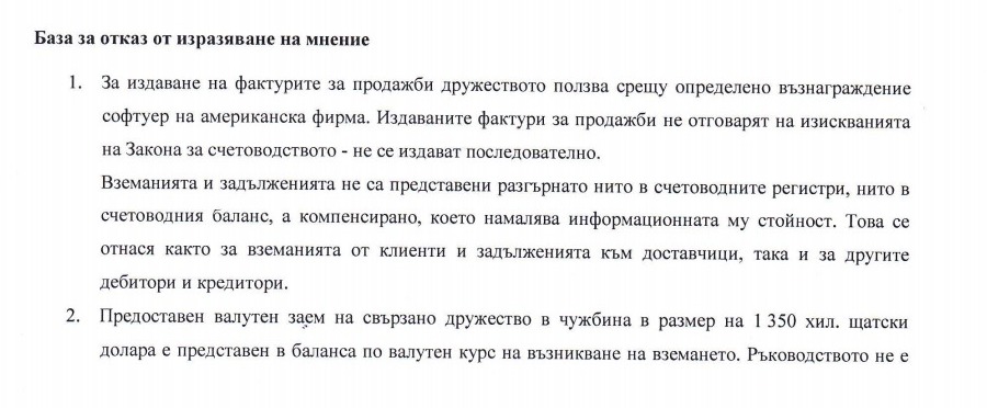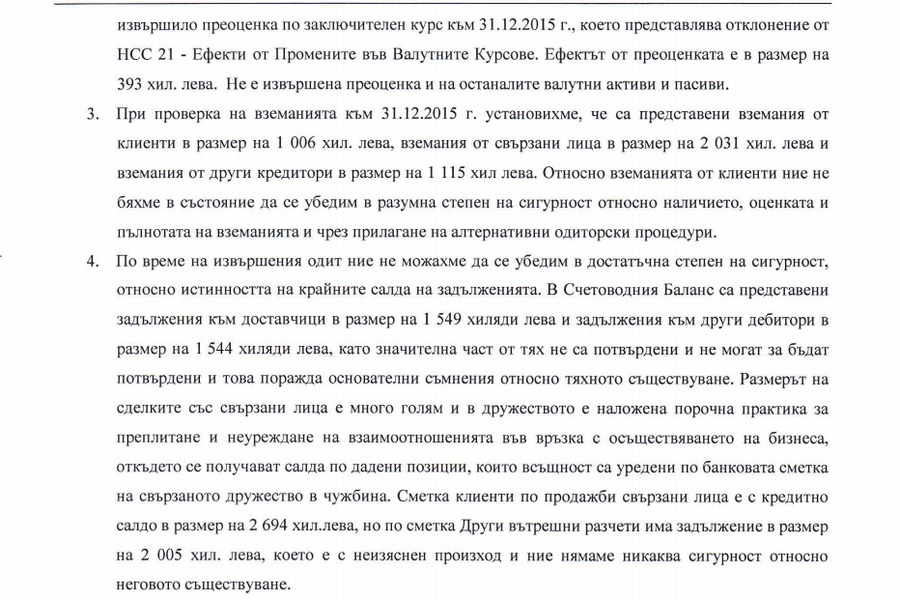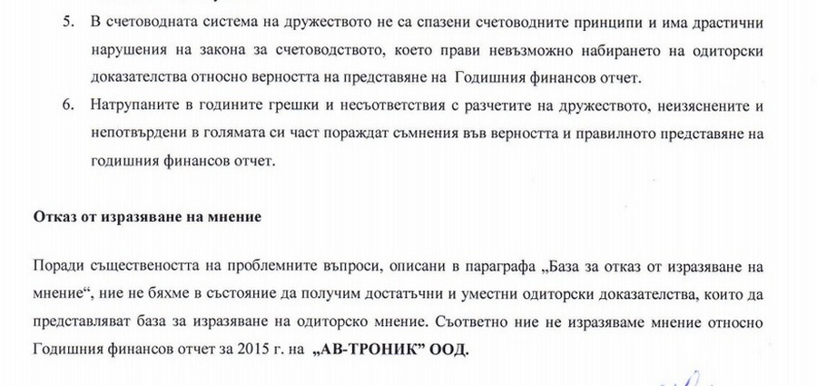 Последният годишен финансов отчет на "АВ Троникс" в Търговския регистър е от 2015 г. Докладът на независимия одитор е със заключение "отказ от изразяване на мнение". В документа от ТР пише, че одиторите не са могли да се убедят в "истиността на крайните салда на задълженията" на фирмата. Пише още, че в счетоводната система на дружеството не са спазени счетоводни принципи и има "драстични нарушения счетоводните закони". Ето факсимилета от доклада на одитора: