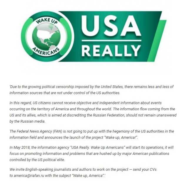 "Федералната Новинарска Агенция" няма да се примири с хегемонията на американските власти в сферата на информацията и поради тази причина обявява своя нов проект "Събудете се, американци!". През май 2018 г. информационната агенция "USA Really. Wake Up Americans" ще започне да предава проблеми, укривани от медиите на американскя елит. Каним журналисти и автори с високо ниво на английски език да се включат в нашия проект"