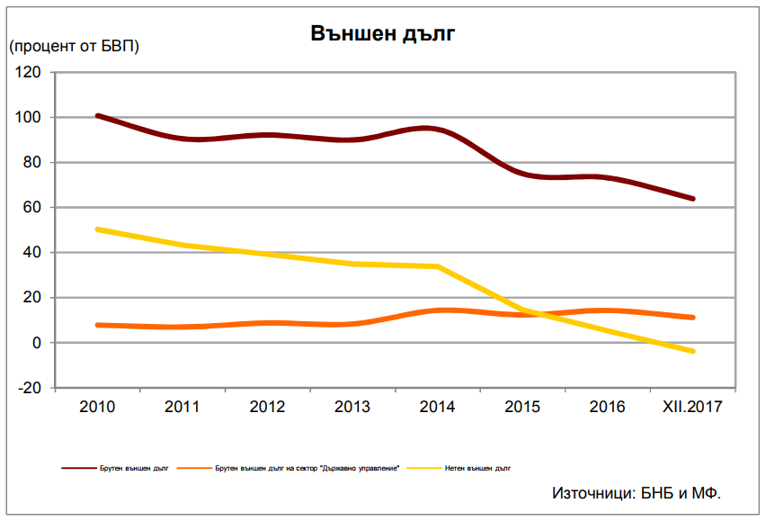 БНБ също констатира преди време, че брутният външен дълг на България - частен и държавен, за миналата година се е свил до 32.564 млрд. евро, като намалява с 4.4% (1.481 млрд. евро) на годишна база.