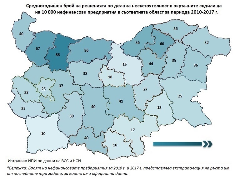 Картата на страната по средногодишен брой на решенията по дела за несъстоятелност на 10 хиляди нефинансови предприятия за периода 2010-2017 г. показва известна клъстеризация на областите, т.е. струпване на делата в определени области.
