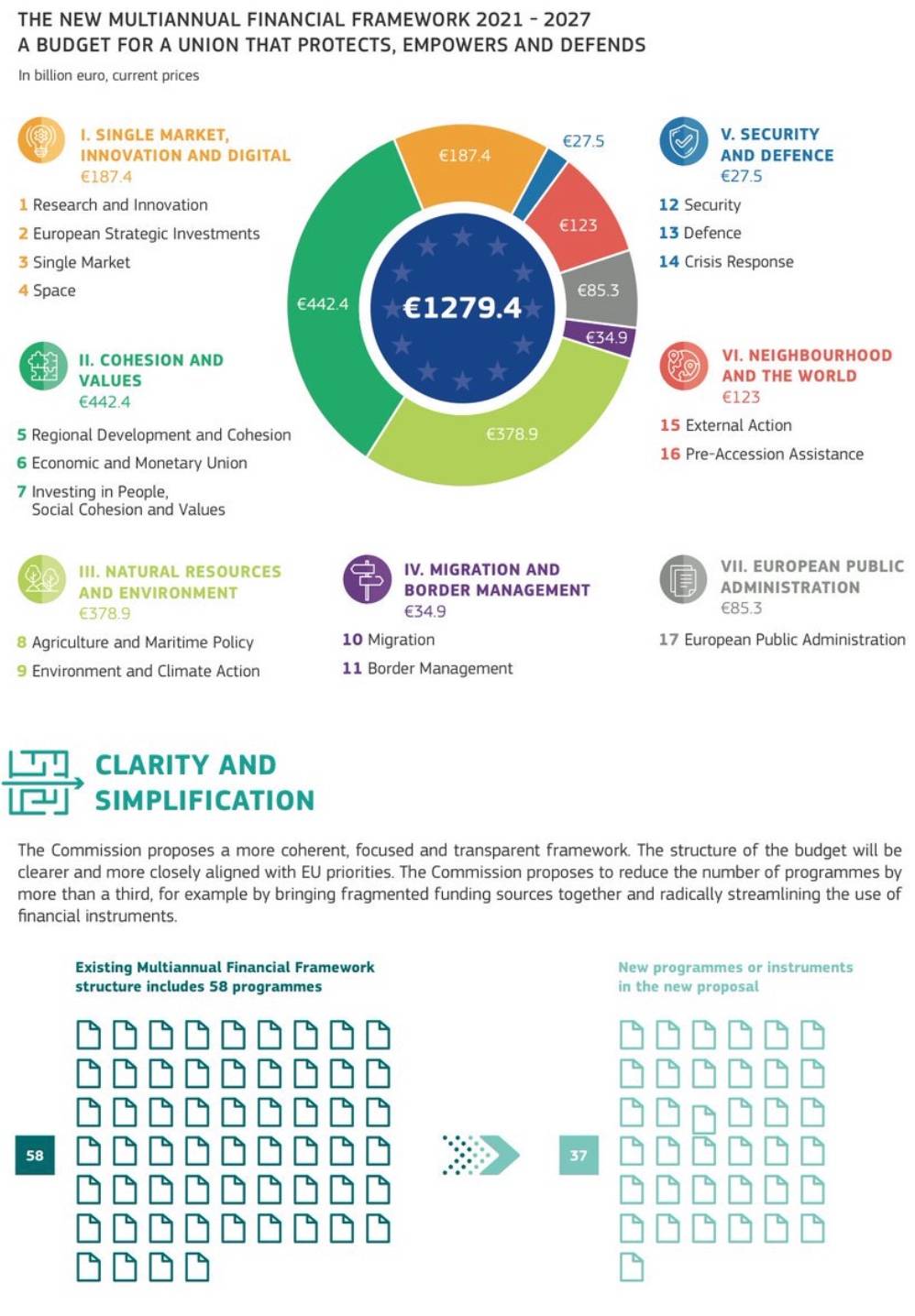Броят на програмите да бъде намален с над една трета - от настоящите 58 на 37 в бъдеще, предлага Еврокоисията, например чрез "обединяване на разпръснати източници на финансиране в нови интегрирани програми и чрез радикално рационализиране на използването на финансовите инструменти".