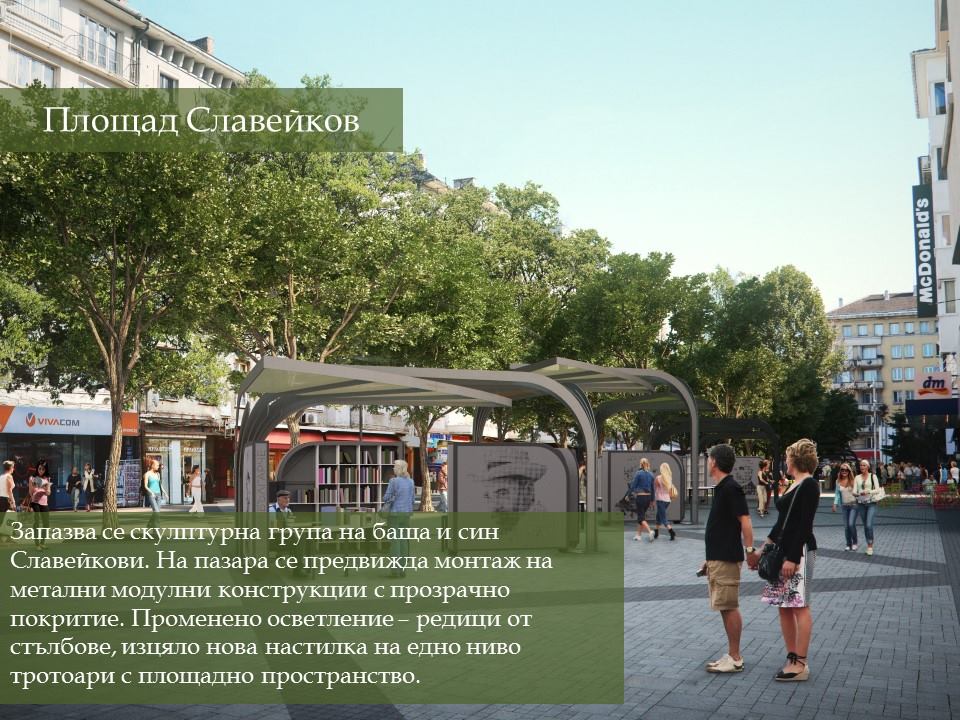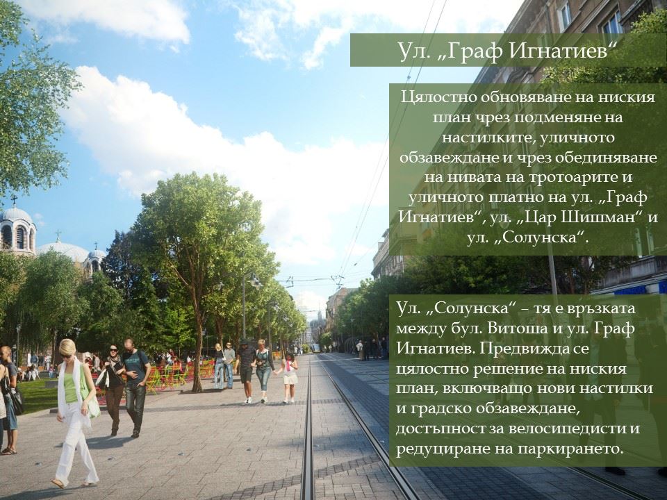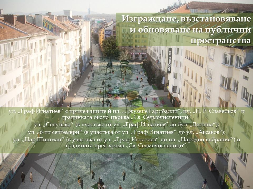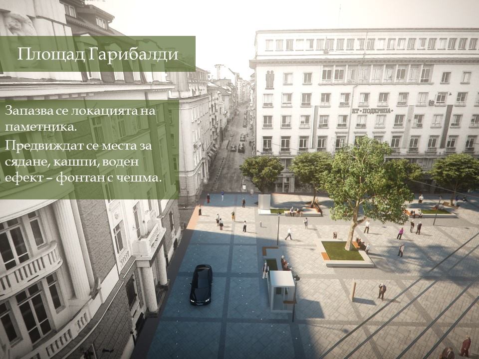 Настилките по ул. „Граф Игнатиев“, пл. „Славейков“, пл. „Гарибалди“, градината пред църквата „Свети Седмочисленици“ ще бъдат изцяло подменени. Настилките ще бъдат комбинация на гранитни павета и бетонови с много високи заложени характеристики на здравина.