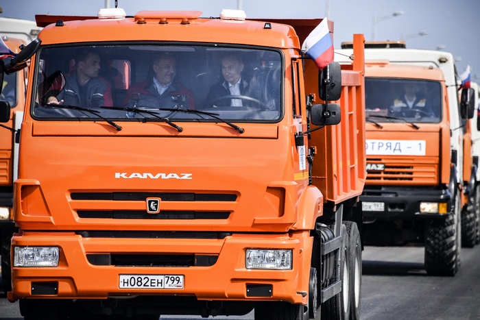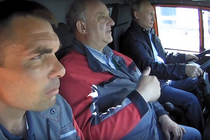 Руският президент Владимир Путин мина през най-скъпия мост в света, седнал зад волана на камион "КамАЗ".