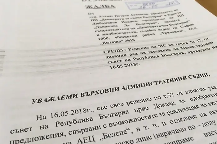 "Демократична България" подаде във Върховния административен съд (ВАС) жалба срещу решението на Министерския съвет от 16 май, с което правителството внесе в Народното събрание доклад с варианти за бъдещето на проекта за АЕЦ "Белене". Става дума за доклада на министър Теменужка Петкова, внесен и в Народното събрание по негово решение от март тази година, в който се разглеждат три варианта за съдбата на спрения през 2012 г. проект и предложението е той да бъде рестартиран като се търси инвеститор.