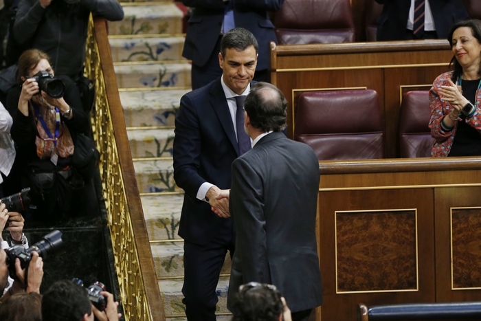 Със само 84-ма депутати в долната камара на парламента Санчес, който не е вече депутат и не разполага с трибуната, която представлява парламентът, беше принуден да се съюзи с "Подемос", каталунските сепаратисти и баските националисти, за да свали Мариано Рахой днес чрез вот на недоверие.