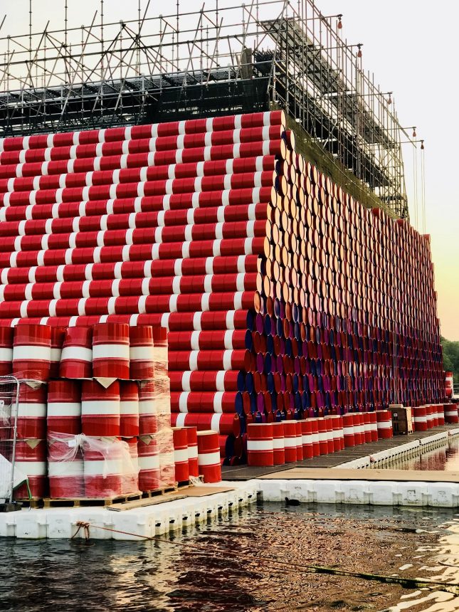 Екип от инженери и работници сглобяват произведението от 7506 варела, поставени хоризонтално върху плаваща платформа. Височината на инсталацията е 20 метра, широчината – 30/40 м, с наклон на стените 60°.