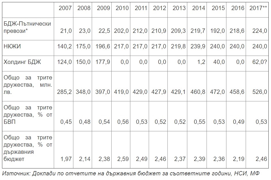 Данните за отпуснатите субсидии за текуща дейност и капиталови трансфери са видни от годишните доклади по отчета за изпълнението на държавния бюджет. Докладът за 2017 г. все още не е публикуван, така че за миналата година все още няма яснота дали отпуснатите в крайна сметка суми на жп компаниите са същите като заложените в приетия бюджет. Предвид това, че през миналото лято по спешност беше гласувана държавна помощ на холдинг БДЖ от 62 млн. лв. (де факто капиталов трансфер), с която да се погасят задължения по кредити и към НАП, то най-вероятно сумата за трите дружества ще е набъбнала над 500 млн. лв. за годината.