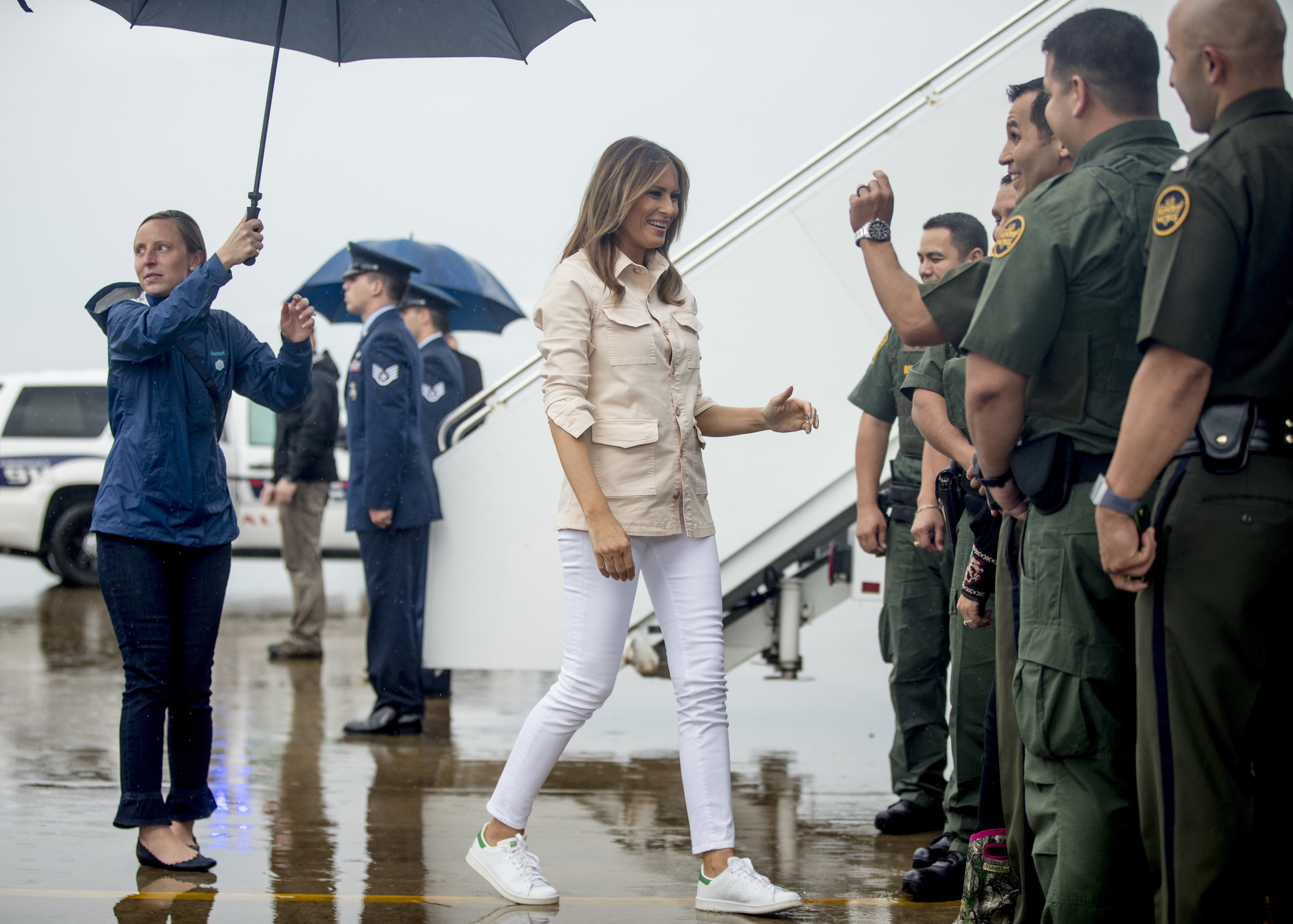 Първата дама се преоблече с бледожълто яке, преди самолетът да кацне в Макалън, Тексас, за посещението в центъра, където са настанени 55 деца мигранти.