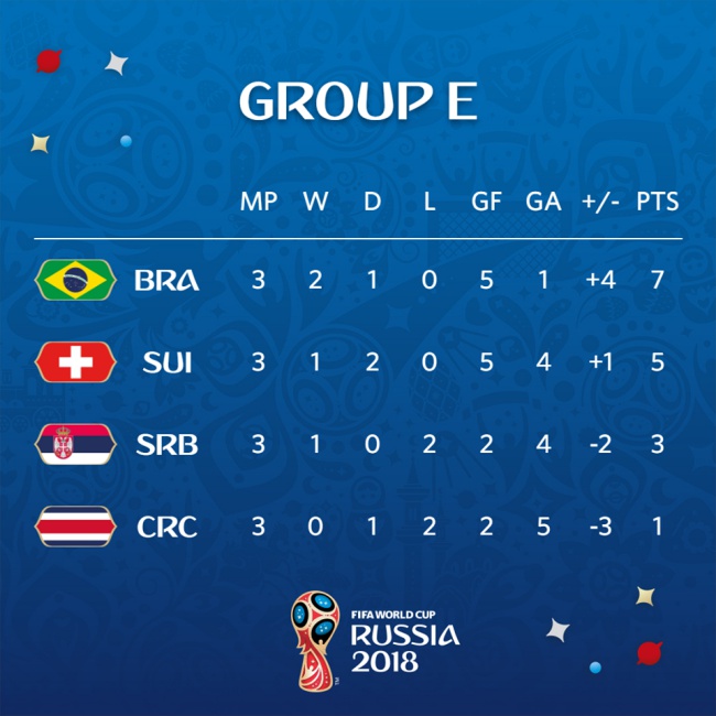 Бразилия и Швейцария са на осминафиналите в Русия 2018 от гр. Е. "Селесао" победи Сърбия с 2:0, Швейцария и Коста Рика направиха 2:2, но и равенството стигна на "часовникарите" за следващата фаза.