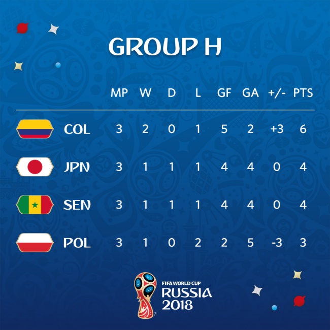 Колумбия оглави група Н с 6 точки. Днес тимът победи Сенегал с 1:0, а Япония падна със същия резултат от Полша, тимът на която нямаше шанс да продължи напред. "Дружина полска" остана на последно място с три пункта.