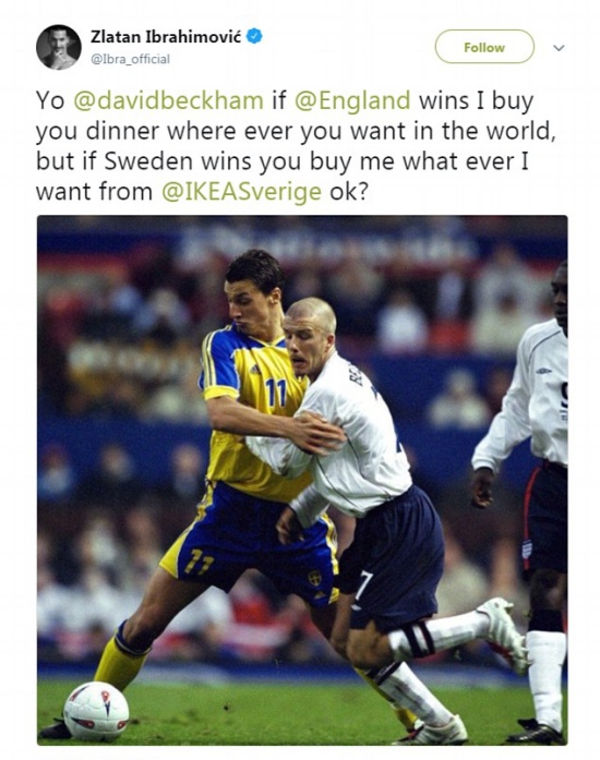 "Йо, Дейвид Бекъм, ако Англия победи ще те заведя на вечеря където поискаш. Но ако Швеция спечели, ти ще ми купиш каквото поискам от ИКЕА. ОК?"