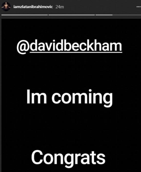 "Дейвид Бекъм, идвам. Поздравления", лаконично написа Златан на черен фон в профила си в инстаграм.