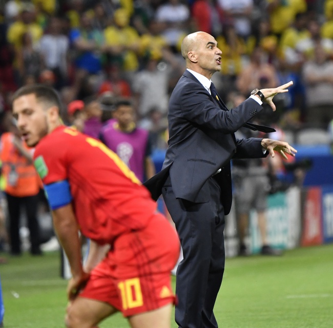 Треньорът на белгийците Роберто Мартинес и Еден Азар.