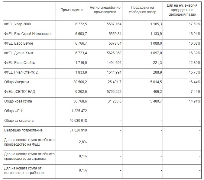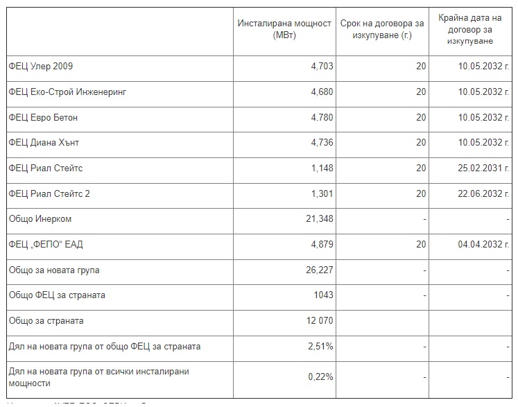 Трудно може да се твърди, че след придобиване на активите на ЧЕЗ новото дружество ще увеличи дела на производство на ел. енергия от фотоволтаични електрически централи (ФЕЦ), тъй като той е пренебрежимо малък – едва 2,5%, както се вижда от Таблица 1.