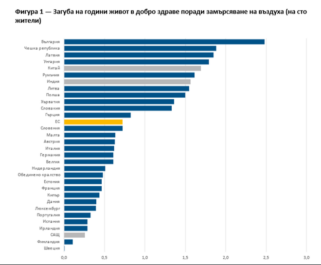 Страната ни е убедителен първенец по критерия за загуба на години живот в добро здраве поради замърсяване на въздуха. У нас тя е 2.4 на 100 жители (виж графиката). В това отношение превишаваме повече от два пъти средния показател на ЕС.
