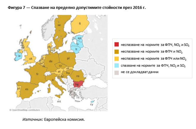 Тя е единствената страна членка на ЕС, срещу която Еврокомисията е предприела действия за налагане на изпълнението на Директивата за качеството на атмосферния въздух (КАВ). Мярката е взета заради превишаването на пределно допустимата стойност на серен диоксид на деноноищие. Но пък и тази стойност не е особено стриктна, се отбелязва в доклада.