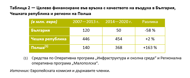 За сметка на това България единствена от посетените от експертите на ЕСП страни е намалила значително – с цели 58 на сто, целевото финансиране по кохезионната политика на ЕС за качеството на въздуха през програмния период 2014-2020 г. В сравнение с предишния период. От 120 милиона евро сумата е намаляла на 50 милиона, т.е. повече от двойно.