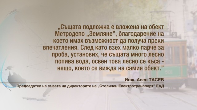 Ето какво пише инженер Тасев в свое становище: "Същата подложка е вложена на обект Метродепо „Земляне”, благодарение на което имах възможност да получа преки впечатления. След като взех малко парче за проба, установих, че същата много лесно попива вода, освен това лесно се къса – нещо, което се вижда на самия обект."