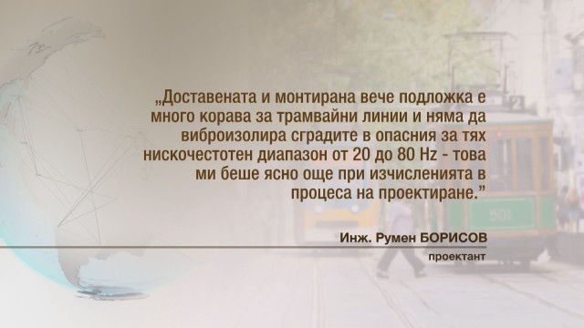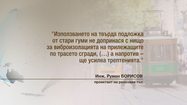 „Виброизолационната подложка е най-важната част от проекта ми – трамвайните линии са разположени много близко до сградите и са подложени на силни вибрации от преминаващите мотриси.. Налагаше се да одобря виброизолационна подложка (…), която въобще не отговаря на проекта, а и има отстранен участник от тръжната процедура, който я е предложил точно същата”, пише Борисов.