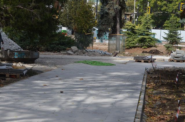 По неясни причини асфалтът в градинката на църквата „Св. Седмочисленици“ бе премахнат и „възстановен и обновен“ с плочки в стил „балатум с повърнато и размазано“. Стана ясно и че тези плочки, които влязоха в остър дисонанс с естетическото чувство на много софиянци, изобщо не са предвидените по проект. Междувременно разбрахме, че строителната фирма не може или не иска да спази договорените планове, материали и срокове – или поне така обясняват сега от Общината. Появиха се сигнали за дълбоки и смущаващи нередности, явно и нарушение на закона за обществените поръчки (ЗОП) и влагането на неподходящи материали със съмнителен ефект в проекта.