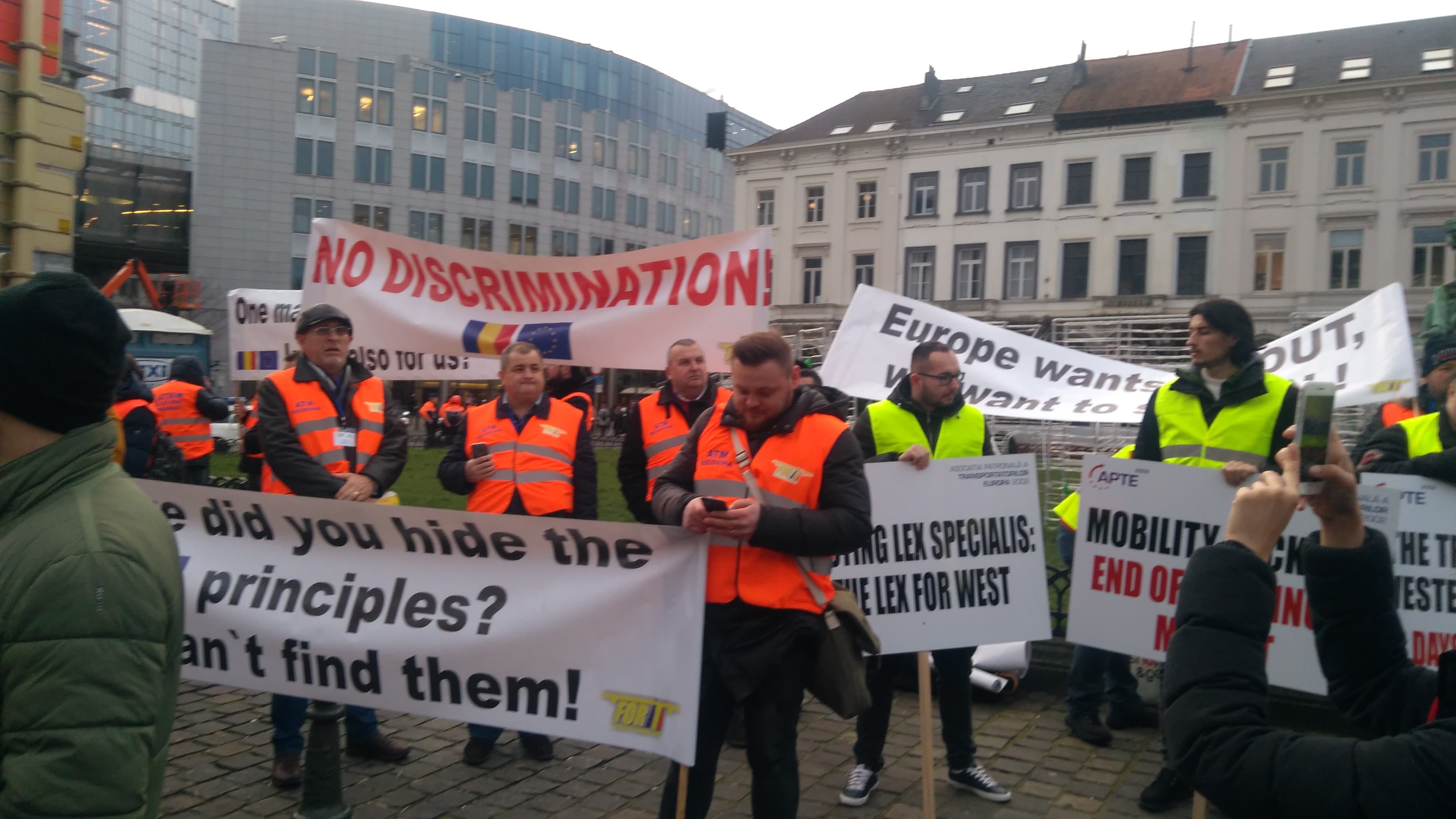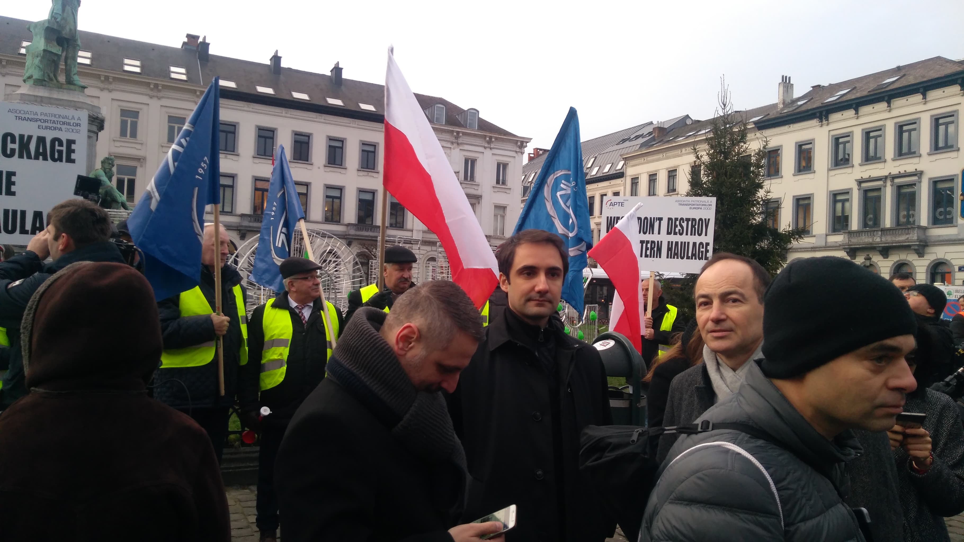 Българският химн, "Вятър ечи, Балкан стене", "Стани, стани, юнак балкански", "Боят настана"... Това слушаше площад "Люксембург" пред Европейския парламент в Брюксел тази сутрин. Причината - протестът на превозвачите, недоволни от т.нар. план "Макрон", който е и тема на комисията по транспорт. Освен български превозвачи в протеста участват още техни румънски и полски колеги, шофьори от Унгария, както и от прибалтийските страни.