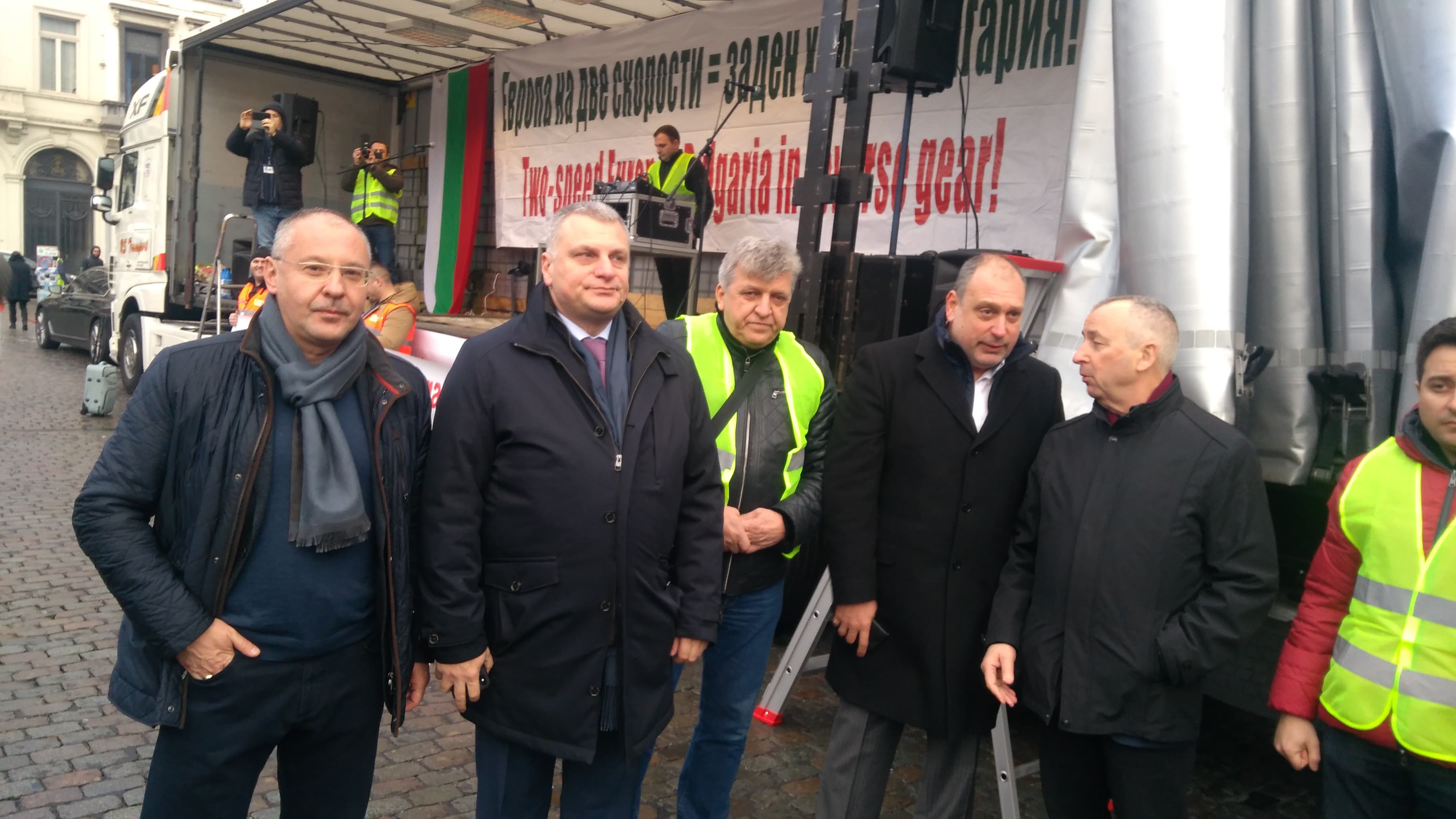 Българските евродепутати от всички цветове - начело с президента на ПЕС Сергей Станишев и Андрей Ковачев от ГЕРБ, Ангел Джамбазки от ВМРО, социалиста Петър Курумбашев, Филиз Хюсменова и Илхан Кючюк от ДПС - с подкрепление от родни депутати от транспортната комисия, водено от председателя й Халил Летифов, също бяха на площада редом до протестиращите шофьори.