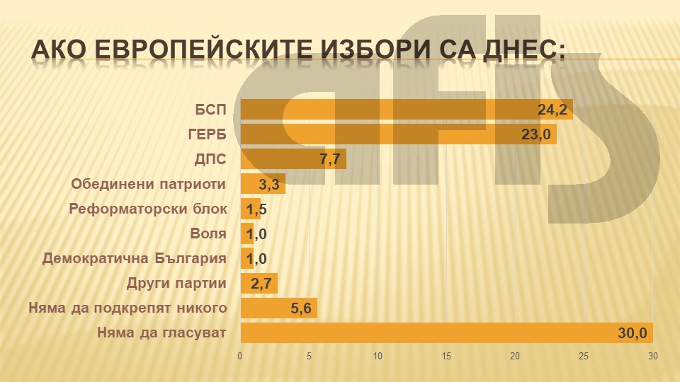 Шансовете на основните претенденти – БСП и ГЕРБ – са изравнени. На предстоящите евроизбори за БСП биха гласували 24,2 на сто от избирателите, а за ГЕРБ - 23%. В рамките на статистическата грешка се регистрира леко предимство за соцпартията.