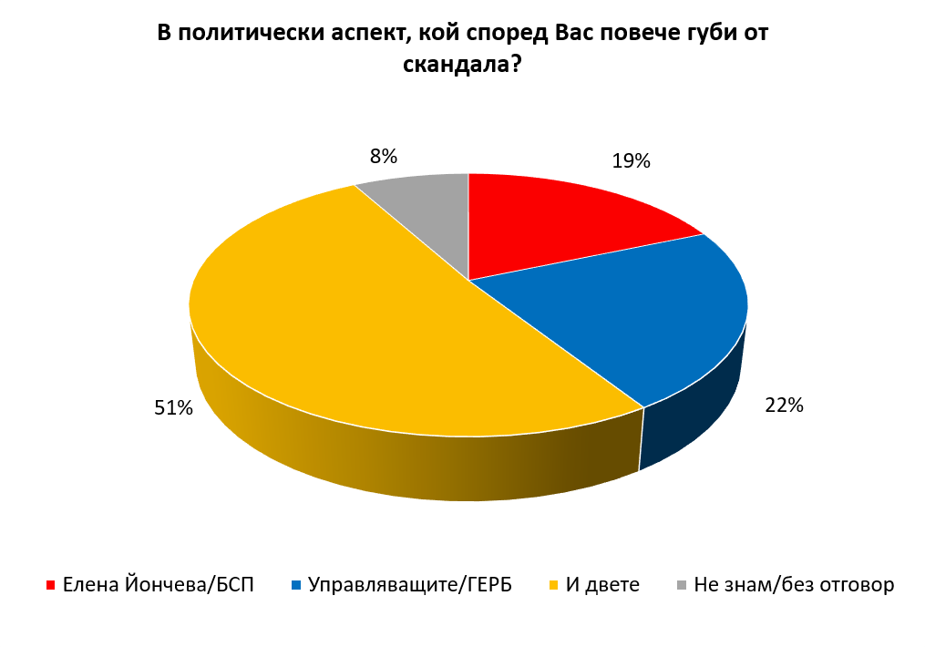 На въпрос кой губи от скандала мненията се разделят. Според 22 на сто това е управляващата партия ГЕРБ, а 19% избират опцията „Йончева и БСП“. Дяловете са в близки стойности, но са показателни за посоката на обществените настроения. Над половината смятат, че и двете страни са губещи.