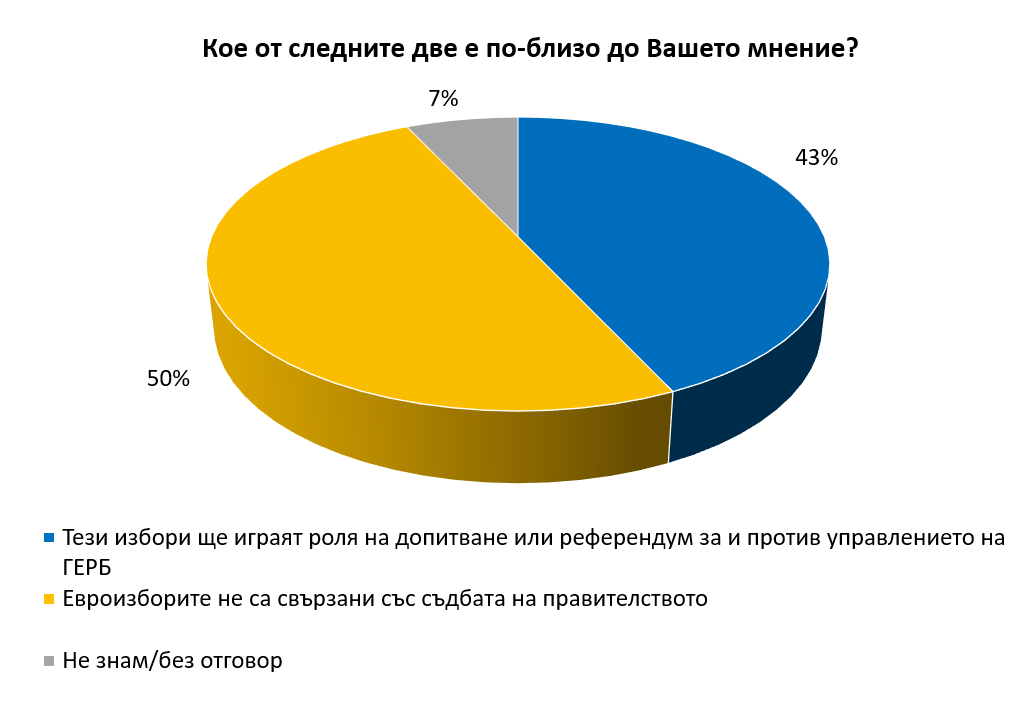 Поливината от анкетираните не намират пряка връзка между евроизборите и съдбата на правителството. 43% обаче смятат, че евроизборите всъщност ще играят ролята на допитване или своеобразен референдум за съдбата на правителството и ГЕРБ. Останалите се колебаят. И тук дяловете са сходни и това показва известна поляризация на общественото мнение.