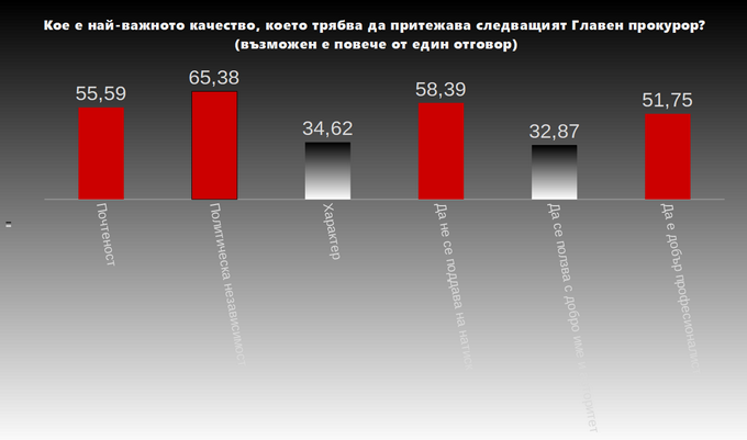 Показателни са отговорите на въпроса: "Кое е най-важното качество, което трябва да притежава следващият главен прокурор?" При възможност участниците в изследването да дават повече от една препоръка, цели 3 отговора са посочени като приоритетни пред този да е добър професионалист. А именно: политическа независимост, да не се поддава на натиск, почтеност.