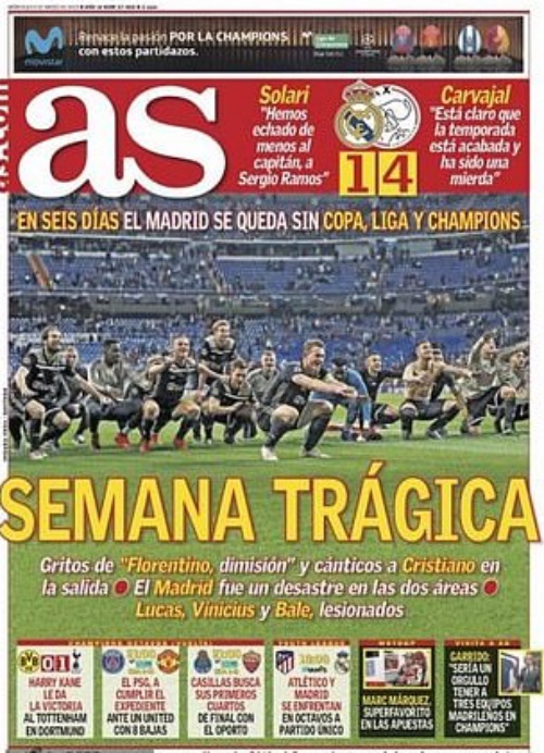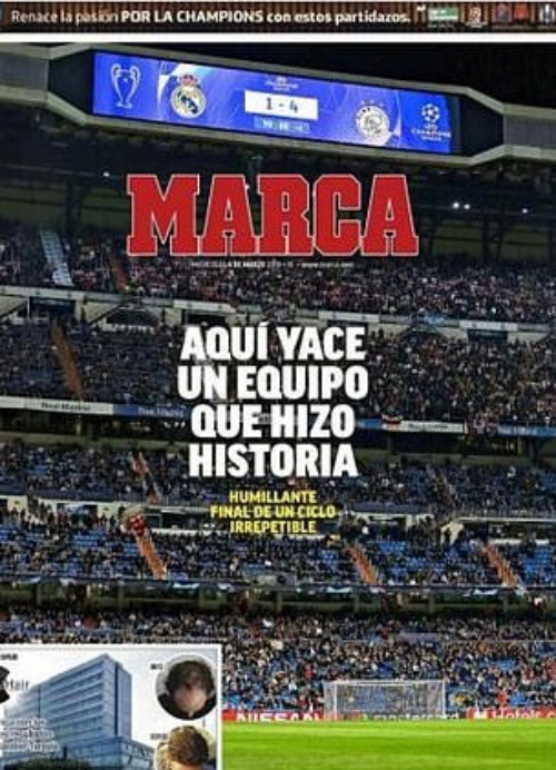 "Тук лежи един отбор, който направи история", това е заглавието на приближения до клуба в. "Марка" (долу) върху снимка на опразващия се "Сантяго Бернабеу".