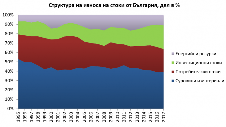 Извън суровините и инвестиционните стоки другите две големи групи в износа – потребителските стоки и енергийните ресурси показват по-колеблива динамика. При енергийните ресурси също се вижда нарастване на дела спрямо 1995 г., докато при потребителските стоки, въпреки известно нарастване в началото на хилядолетието, делът остава почти без промяна спрямо базовата 1995 г.