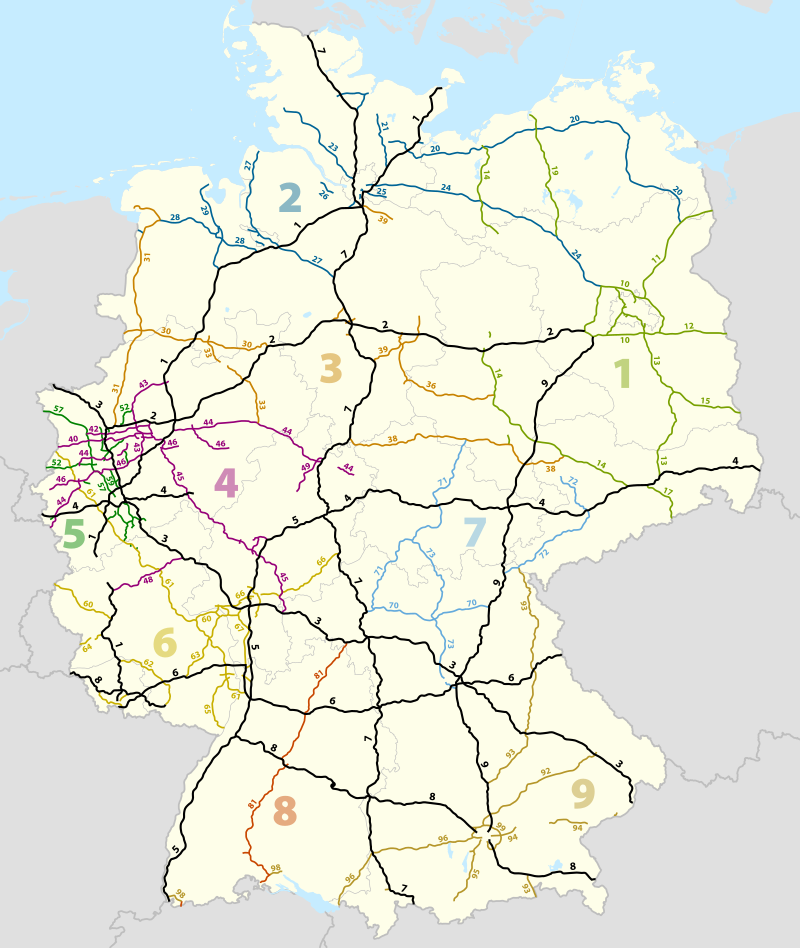 Към настоящия момент Федералната република разполага с мрежа от високоскоростни пътища с обща дължина 13 009 километра (на четвърто място в света след Китай, Съединените щати и Испания) и не спира да да я разширява – за да улесни шофьорите, пътуващи нерядко по стотина километра за работа. Магистралите с едноцифрен номер – като А3, например, са с национална или дори международна важност, тези с двуцифрени номера са предимно надрегионални, а трицифрените вече могат да бъдат определени и като такива със съвсем местно значение. От 2005-а тежкотоварните камиони плащат такси за минаването по автомагистралите в Германия, но за леките автомобили подобна мярка трудно би намерила приложение, макар за нея да се говори интензивно.