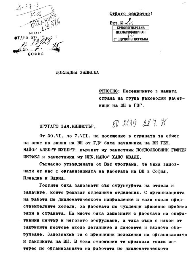 Документът представлява строго секретна докладна записка относно: Посещението в нашата страна на група ръководни работници на външното наблюдение на ГДР.
