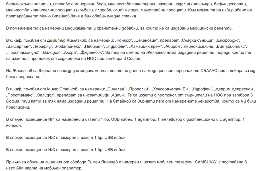 В намерените и иззети с протокол, но и оповестени в прессъобщението находки се изреждат различни лекарства - и при единия, и при другия... Специално се отбелязва към края на въпросните изреждания кой с какво се лекува, както и че Стайков държал без рецепта инсектицид (б.а. - може пък да има в затворническата болница "съквартиранти", които не го кефят).