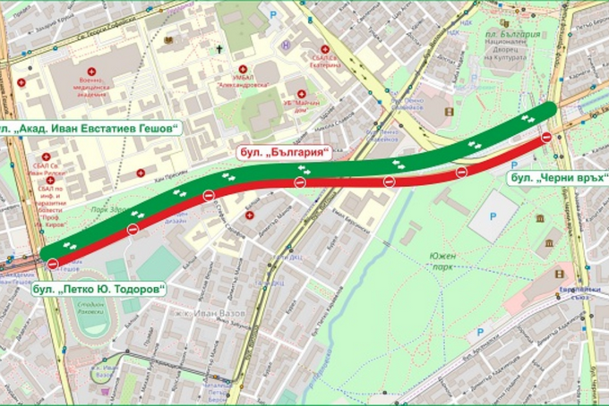 При втори етап от 5 до 19 юли се забранява влизането на пътни превозни средства по южното пътно платно на бул.„България“ в участъка от бул. „Акад. Иван Ев. Гешов“ до бул. „Черни връх“, като движението се извършва двупосочно в северното пътно платно на булеварда в същия участък.