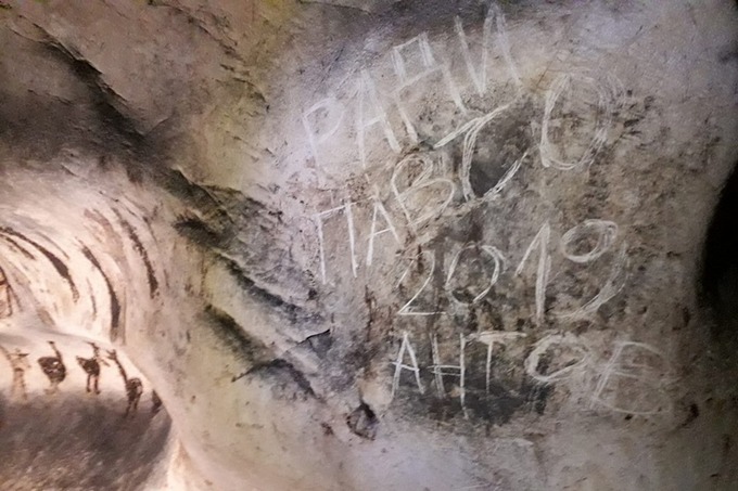 Този първобитен надпис е съвсем съвременен. "Лето 2019-о". Надсраскан е върху автентичните изображения на Магурата. Да се знае!