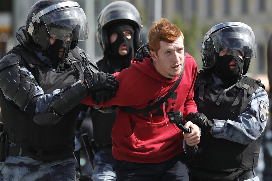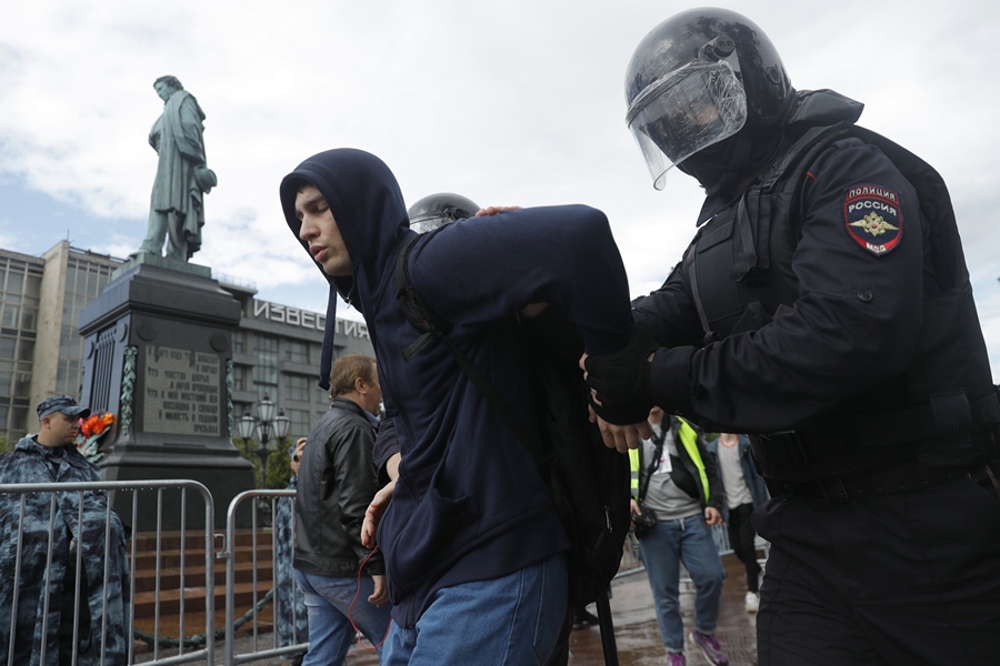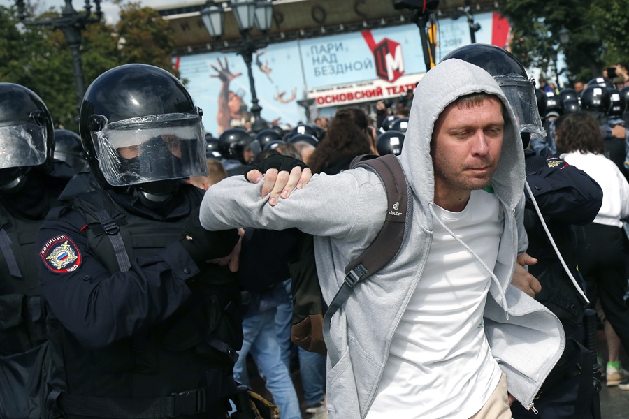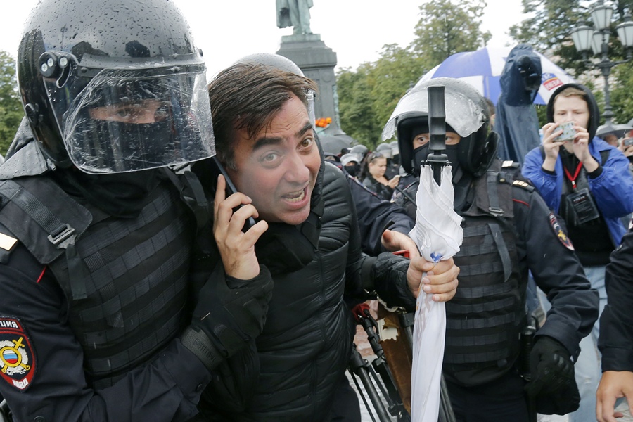 На Пушкиновия площад, сборния пункт, от който трябваше да тръгне протестното шествие, полицията влезе в сблъсък с разпокъсаното множество, стоящо под преваляващия на дъжд, и задържа десетки.