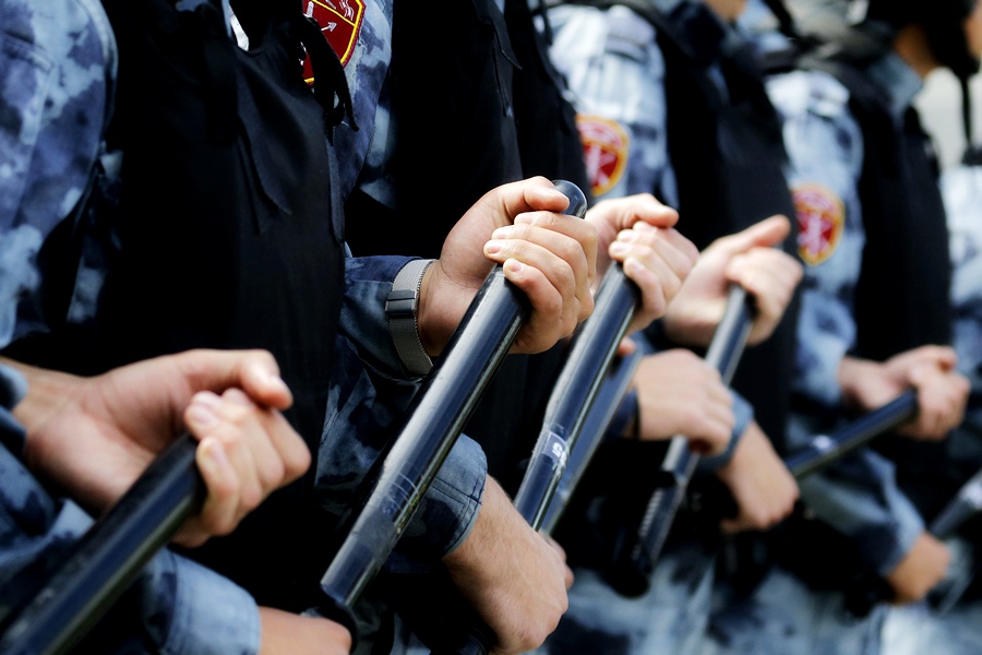 На друг площад по планирания маршрут на протеста, полицейски части за борба с безредици с шлемове, подредени в гъст строй, разпръскваха хората.