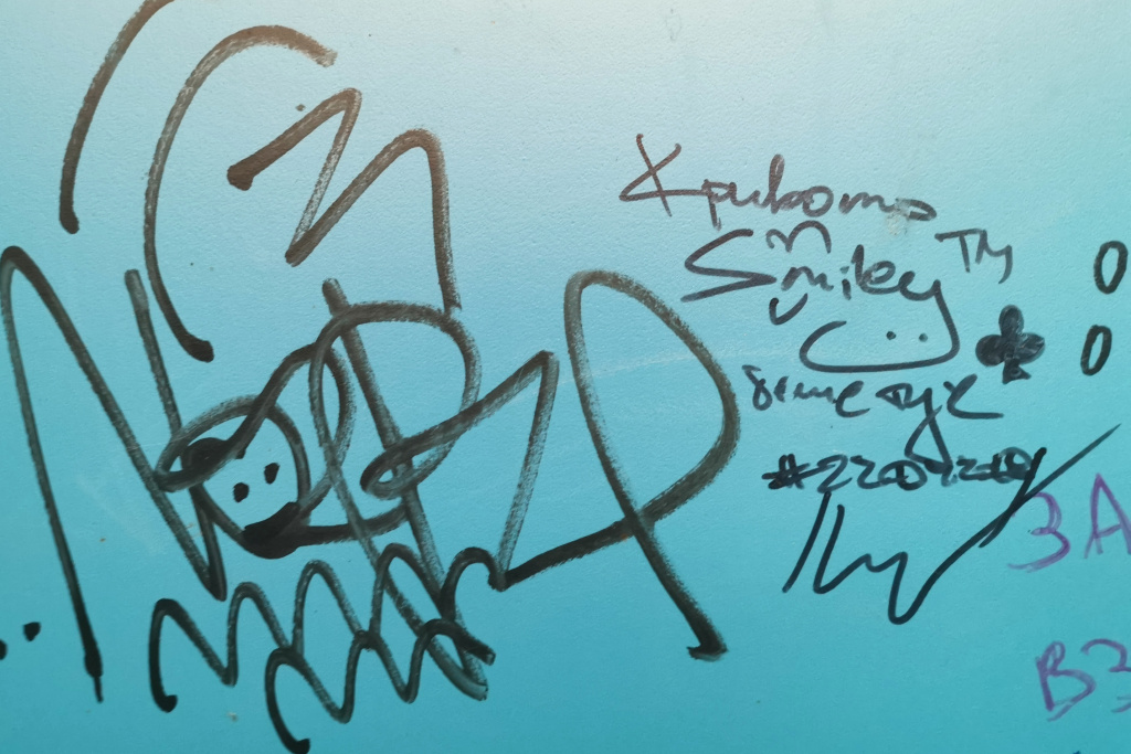Разбира се, всеки се запознава с този вид изкуство в училище. Много е вероятно именно в тоалетната на основното човек да научи фундаменталната дума "К*Р", самостоятелен или насочен към "Левски", "класната", "БСП", "Петя от 5В". В ранния си период всички тези безименни творци неизменно ни съобщават, че споменатата прави "безплатни ми.ети", като за удобство на интересуващите се добавя и телефонният й номер. Сигурно са доста хората, които са видели за пръв път свастика или сърп и чук именно в училищна тоалетна още преди да стигнат до тях в учебниците.