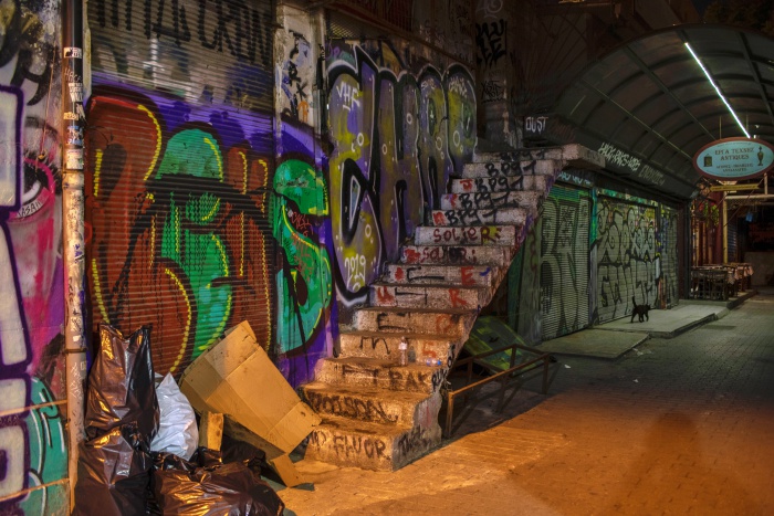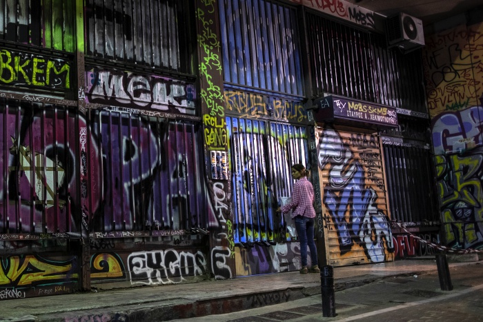 В столицата на Гърция през последните години почти не са останали фасада, гараж, стълбище, подлез, стена на на магазин, които да са в оригиналния си цвят. "Пощадени" от графити са само сгради, около които контролът е много засилен - правителствени здания, банки...