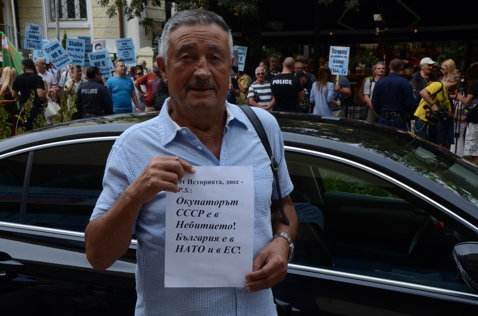 „За мен е чест да се запиша“, упорства възрастен мъж пред масичката за регистрация в сградата на Руския културно-информационен център. Бърза да уточни, че по време на Втората световна война е бил партизанин. А днес е гост на изложба, организирана от посолството на Русия в България, посветена на „75 години от освобождението на Източна Европа от нацизма“. Събитието предизвика размяна на остри позиции между София и Москва, но това ни най-малко не се усещаше сред гостите на събитието.