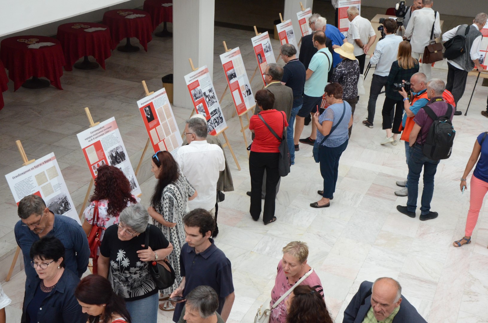 Някои си честитят „празника 9-и септември“. Мнозина са се наредили около експозиции в изложбата, маслени портети на руски военни и полесражения. А на долния етаж са изложени и поредица от пана с архивни документи за Втората световна война – от „пътя към Победата“ на Червената армия, нейната „подкрепа за освободителната борба на българския народ“, фотографии с тълпи, които посрещат съветските солдати с плакати: „Добре дошли освободители“ и „Слава на Червената армия“. Изложени са пропагандни афиши срещу нацизма и фашизма... а в края и кадри от съдебни процеси.
