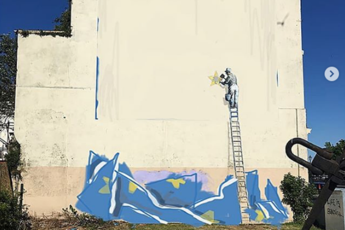 Един от най-популярните графити на артиста Банкси, посветен на "Брекзит", има тъжна съдба. Неотдавна се оказа, че картината в английския пристанищен град Доувър, изобразяваща синия флаг на ЕС и работник на стълба, изчукващ една от жълтите звезди като символ на напускането на Великобритания, е заличена.
